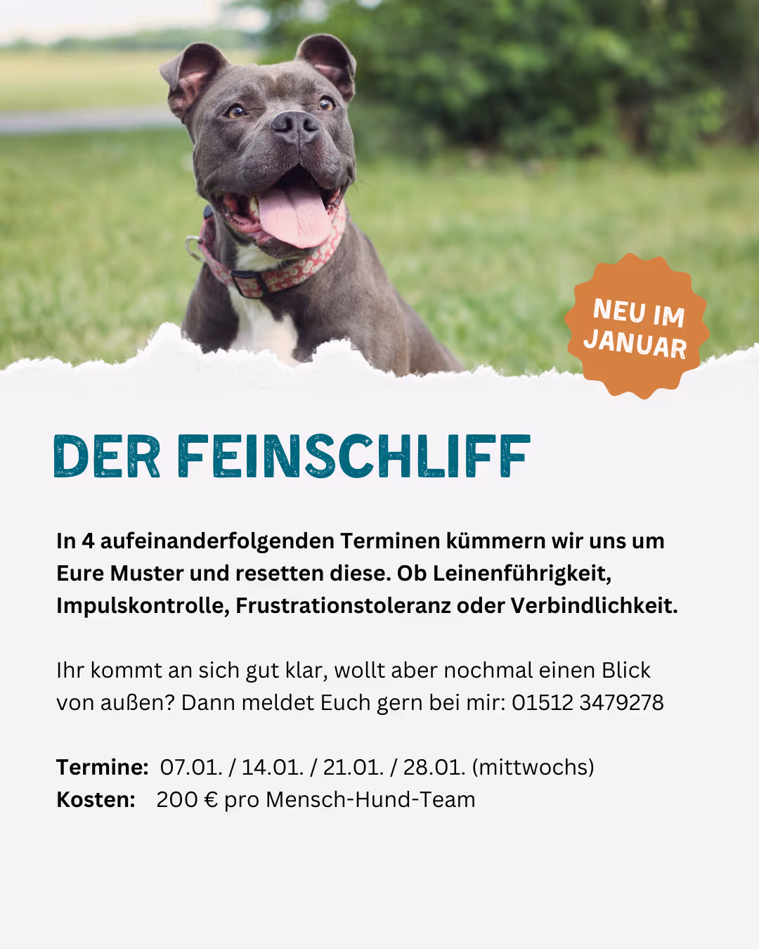 In 4 aufeinanderfolgenden Terminen kümmern wir uns um Eure Muster und resetten diese. Ob Leinenführigkeit, Impulskontrolle, Frustrationstoleranz oder Verbindlichkeit.