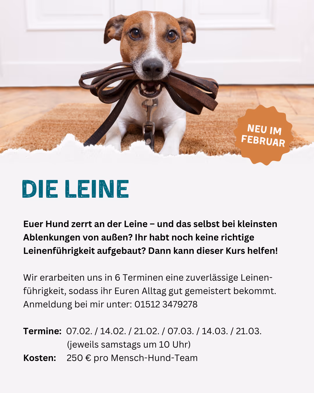 Wir erarbeiten uns in 6 Terminen eine zuverlässige Leinen-führigkeit, sodass ihr Euren Alltag gut gemeistert bekommt.